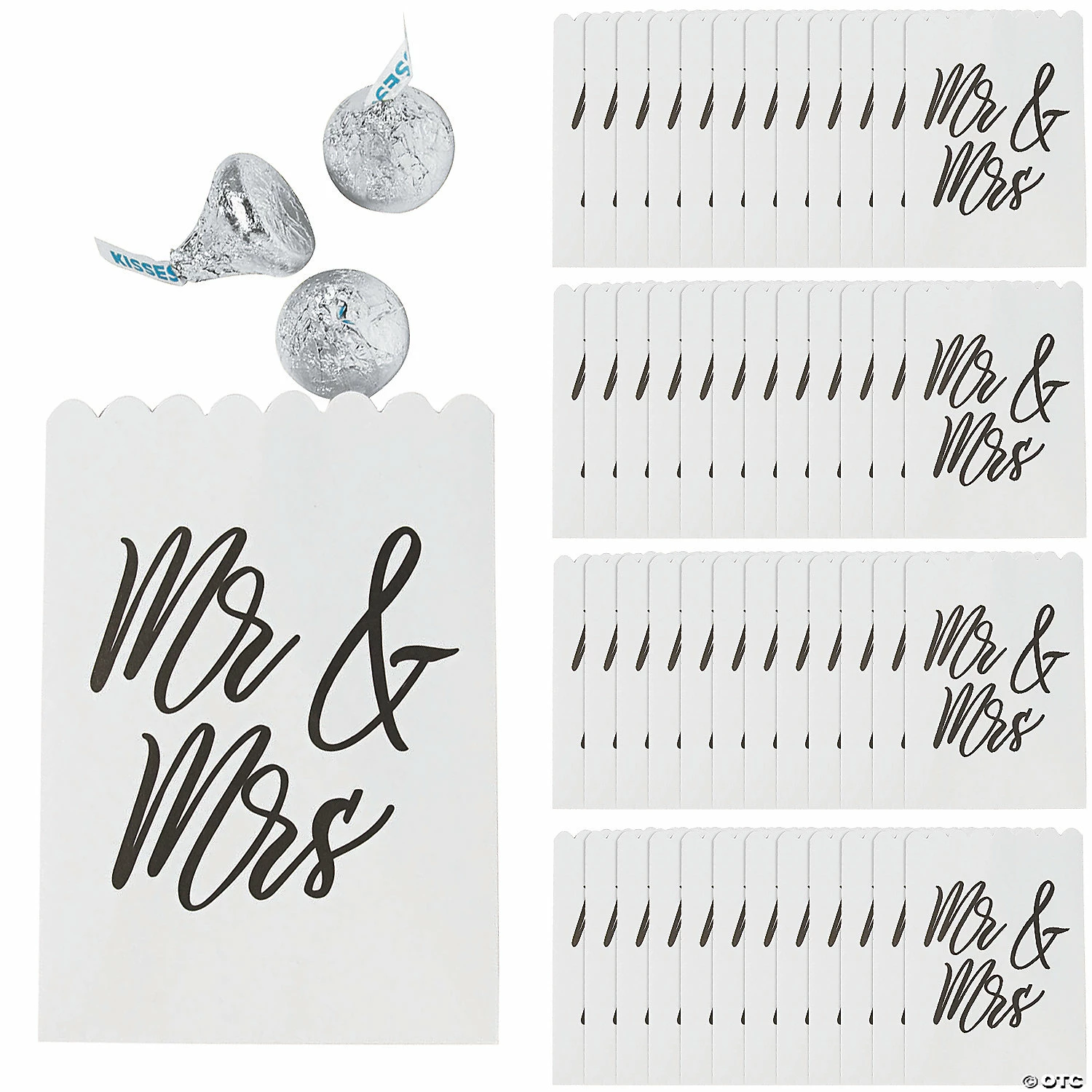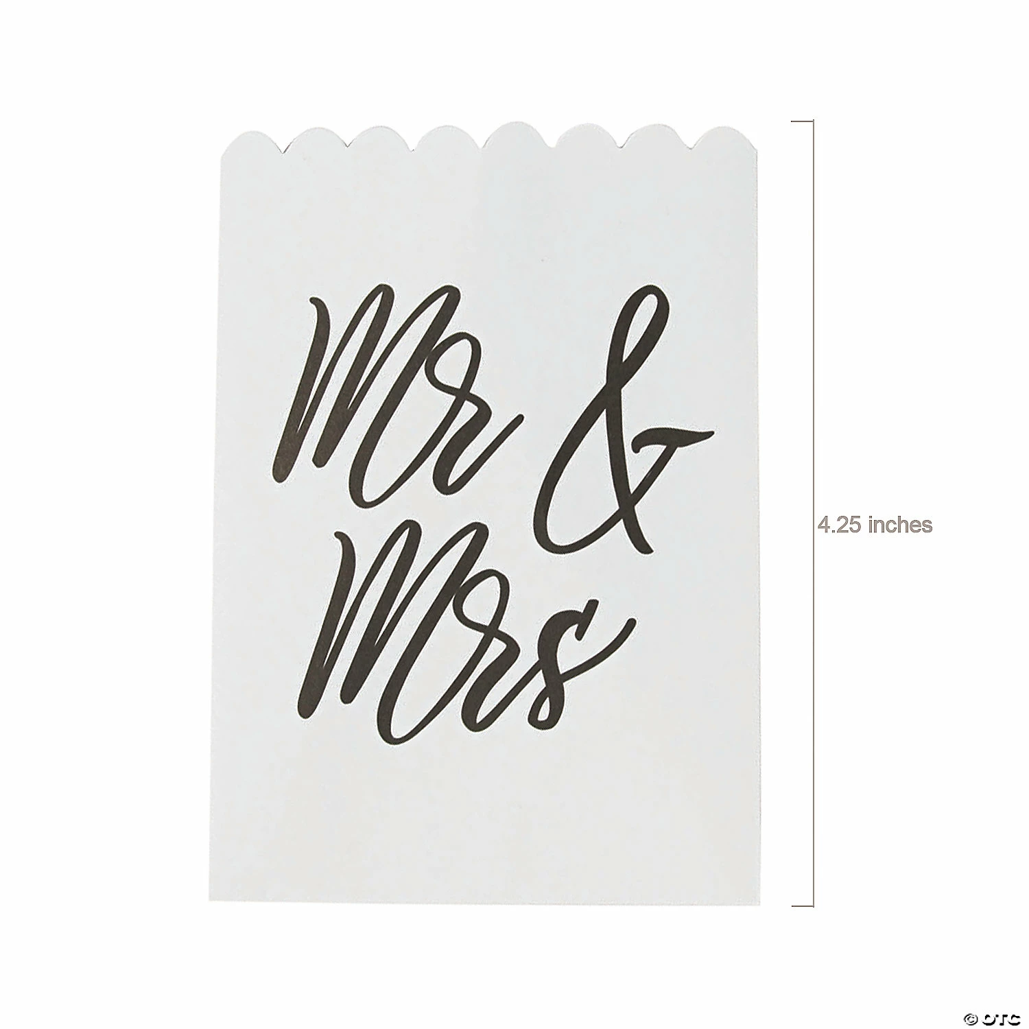 • Perfect Size for Parties: These treat bags are just the right size for candies. Fill them up with tasty treats and hand them out as party favors at your wedding reception! • Sweet Style: Display your delicious delights or party favors in style with these lovely bags! You can make a decorative statement at any event with these bags and a few treats.• Say Thanks with Sweets: Are you looking for an easy way to thank the people in your life? These multipurpose bags filled with dainty bonbons, truffles, and mints are sure to delight the eyes as well as the palate.Product Description:Give guests something sweet at your wedding reception, engagement party or anniversary celebration with these cute bags. Featuring a sophisticated cursive message of “Mr. & Mrs.”, these treat bags are perfect to leave at treat tables or candy buffets so guests can serve themselves. These treat bags are just the right size for little treats as party favors for guests! © OTCSize: 3″ x 4 1/4″Quantity: 50Material: Paper.