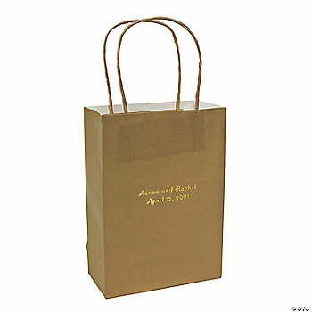 • Easy Gift Wrapping: These sturdy gift bags are suitable for holding a variety of presents and come with easy-to-carry handles. They make wrapping any gift easy breezy!• Quality: These stylish gift bags are sure to make your present stand out from the pack. Just add some tissue paper for a beautiful gift presentation!• All Occasion Use: These versatile gift bags are perfect for year-round gift-giving. From birthdays to baby showers to anniversaries and more, these bags are ready for any occasion!Product Description:Add a special touch to wedding supplies or event supplies with these personalized kraft bags! Welcome wedding guests with these bags full of wedding favors, wedding weekend itineraries or local favorites. Or, use them as personalized anniversary party supplies or any event you’d love to commemorate. Choose a hue that matches your wedding colors or party scheme and you’re set! Personalize with 2 lines of text. Printed with gold foil.Size: 6 1/2″ x 3″ x 9″ with 4″ jute handles.Quantity: 12Material: Paper.© OTC