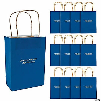 โข Quality: These stylish gift bags are sure to make your present stand out from the pack. Just add some tissue paper and a peronal message for a beautiful gift presentation!โข All Occasion Use: These versatile personalized gift bags are perfect for year-round gift-giving. From birthdays to baby showers to anniversaries and more, these bags are ready for any occasion! โข Travel-Friendly: Once the party is over, your guests will be happy to take home your favorite cookies, cake pops, cupcakes or other baked goods in these easy-to-carry bags.Product Description:Add a special touch to wedding supplies or event supplies with these personalized kraft bags! Welcome wedding guests with these bags full of wedding favors, wedding weekend itineraries or local favorites. Or, use them as personalized anniversary party supplies or any event you’d love to commemorate. Choose a hue that matches your wedding colors or party scheme and you’re set! Personalize with 2 lines of text. Printed with gold foil. ยฉ OTCSize: 6 1/2″ x 3″ x 9″ with 4″ jute handles.Quantity: 12Material: Paper.