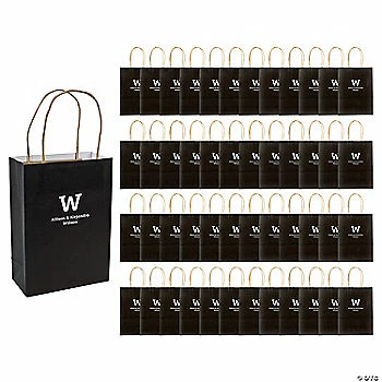 โข Easy Gift Wrapping: These sturdy gift bags are suitable for holding a variety of presents and come with easy-to-carry handles. They make wrapping any gift easy breezy!โข Say Thanks with Sweets: Are you looking for an easy way to thank the people in your life? These multipurpose bags filled with great snacks are a sweet way to spread appreciation among your wedding guests!โข Quality: These stylish gift bags are sure to make your present stand out from the pack. Just add some tissue paper for a beautiful gift presentation!Product Description:Create a unique gift bag for guests at your wedding reception or anniversary party with these pretty bags. These personalized kraft bags come in a variety of colors to go with any color scheme to match any celebration – even milestone birthdays. Best of all, they can be personalized with any message you choose. Perfect for handing out gifts to friends and family or to welcome out of towners with recommendations or local favorites. Printed with gold foil. Monogram with 1 character and 2 lines of text. ยฉ OTCSize: 6 1/2″ x 3″ x 9″ with 4″ handles.Quantity: 48 Pc.Material: Paper.