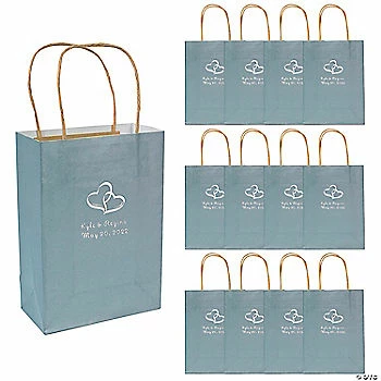 โข Reusable: Go green with this eco-friendly gift bag! They can even be reused for future gifts.โข Easy Gift Wrapping: These sturdy gift bags are suitable for holding a variety of presents and come with easy-to-carry handles. They make wrapping any gift easy breezy!โข Quality: These stylish gift bags are sure to make your present stand out from the pack. Just add some tissue paper for a beautiful gift presentation!Product Description:Two hearts are now joined as one. This timeless wedding accent is the perfect touch to your wedding supplies. Whether you use these bags as welcome wedding bags or as favor bags, they’re a must-have addition to any personalized wedding items. Fill them with some of your favorite things, wedding favors, treats and more. Each gift bag is printed with the two hearts icon and all you need to do is choose the bag in your wedding colors and add your names and wedding date. Personalize with 2 lines of text. Printed with silver foil.Size: 6 1/2″ x 3″ x 9″ with 4″ jute handles.Quantity: 12Material: Kraft paper.ยฉ OTC