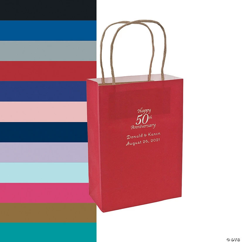 โข Easy Gift Wrapping: These sturdy gift bags are great for holding a variety of small anniversary presents and come with easy-to-carry handles. They make wrapping these gifts an easy task!โข Quality: These stylish gift bags are sure to make your party favors or small gifts stand out. Just add some tissue paper (sold separately) for a charming gift presentation!โข Ready to Gift: With several gift bags on hand, youโll never be unprepared to gift wrap again!Product Description:Show your appreciation for your friends and family while celebrating five decades of wedding bliss! Fill these lovely anniversary favor bags with treats, keepsakes and more to let your loved ones know how much you have appreciated their support over the years. Add your names and your wedding date to these custom bags and include them in your party supplies! Personalize with two lines of text. Printed with gold or silver foil. ยฉ OTCSize: 6 1/2″ x 3″ x 9″ with 4″ jute handles.Quantity: 12Material: Paper.