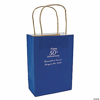 Wholesale ๐ Blue Medium 50th Anniversary Personalized Kraft Paper Gift Bags with Silver Foil – 12 Pc. ๐งจ