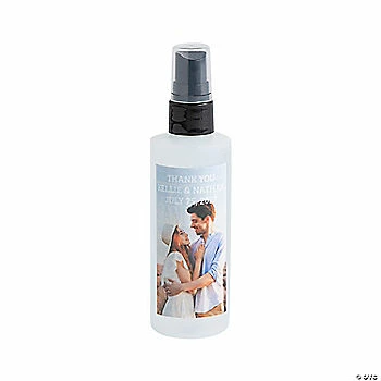 These custom stickers were designed to fit our hand sanitizer spray bottles, but they can be used for just about anything! Treat them as custom labels for wedding supplies and favors or add them to your own hand sanitizer bottles to keep folks safe. Hand sanitizer sold separately. Upload your own photo. Personalize with 3 lines of text. Vinyl. (2 dozen per unit) 1 3/4″ x 3″ © OTC