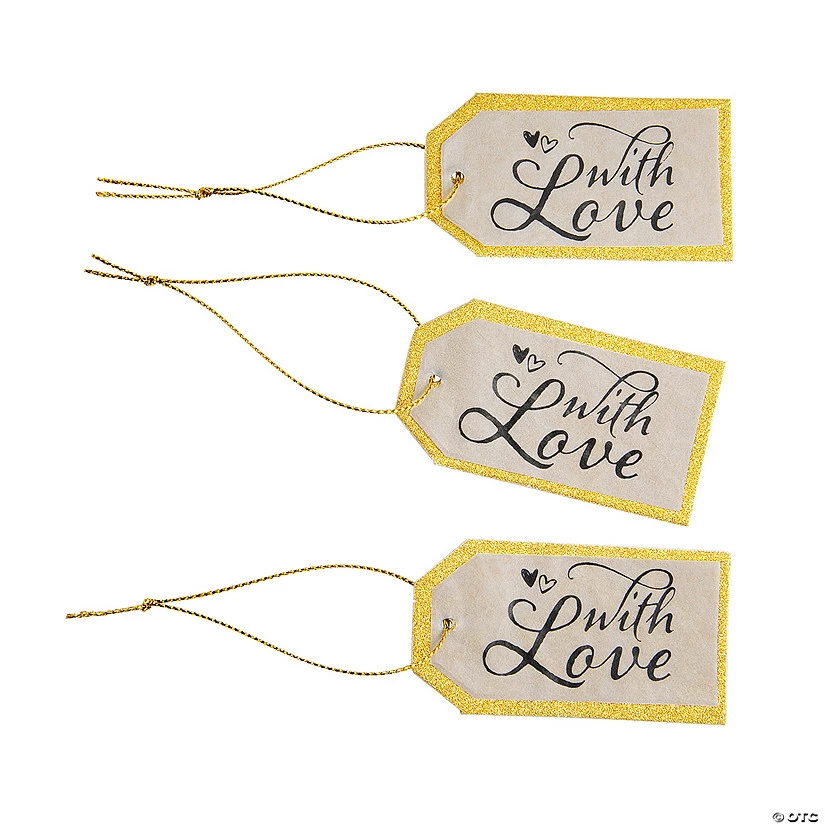 These wedding favor tags are the perfect addition to your wedding favor bags. With the bright sparkle of gold glitter and the sweet sentiment, βwith Love,β written on them, they are sure to make your wedding guests smile. Add them as the finishing touch to your wedding favors. Cardstock. (2 dozen per unit) 2 3/4″ x 1 1/2″ Β© OTC