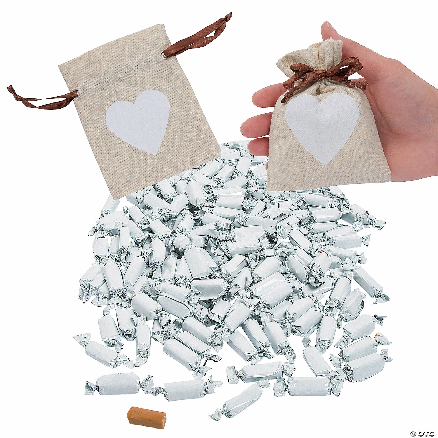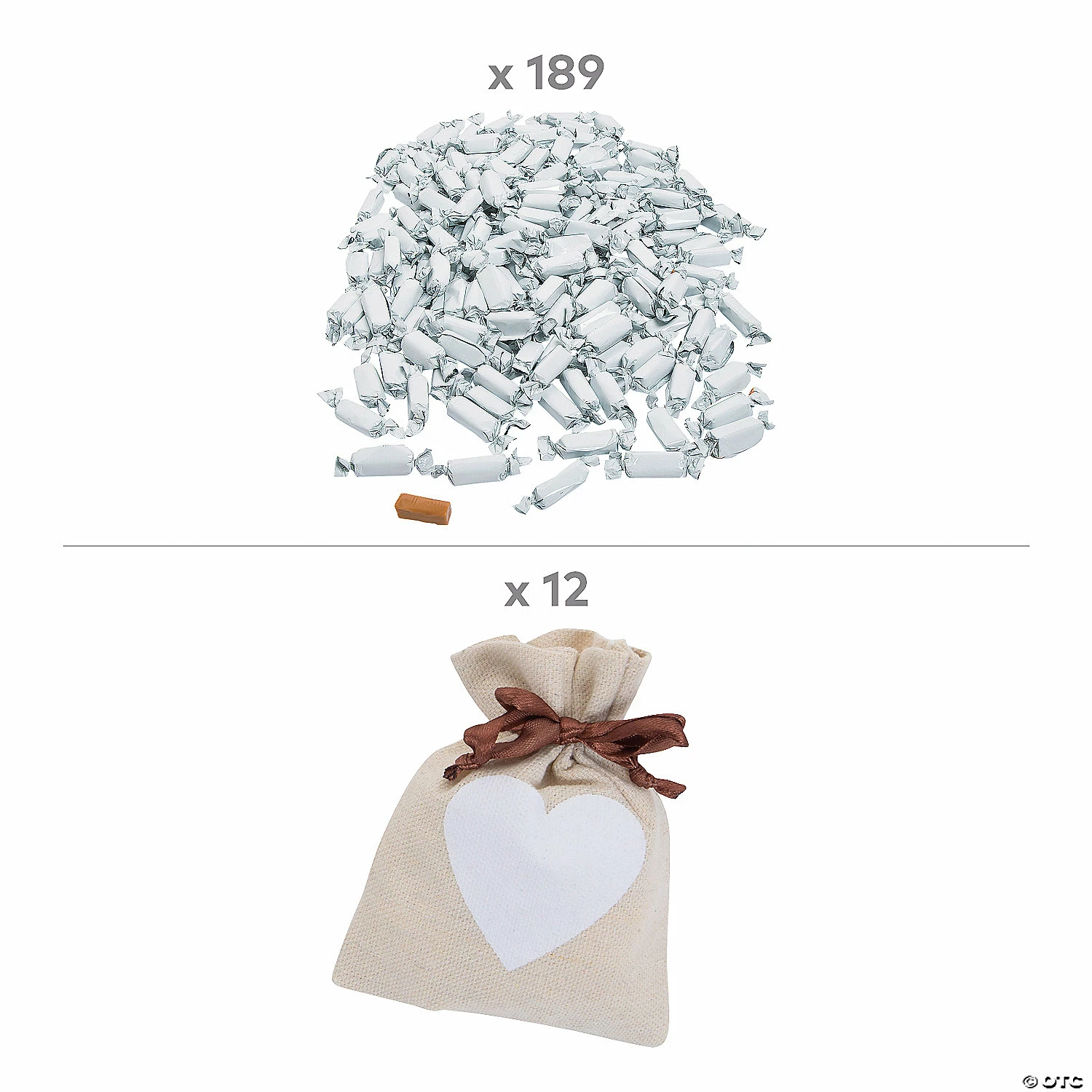 Hand out some lovely and sweet party favors at your wedding reception, engagement party, rehearsal dinner or anniversary celebration with this helpful kit. With enough canvas heart drawstring bags and foil-wrapped caramel treats for up to two dozen guests, this kit makes it easy to put together some impressive party favors. (25 pcs. per unit) Simple assembly required. Assortment may vary.Includes:β’ 24 Canvas Heart Drawstring Favor Bags (3 1/2″ x 3 1/2″ x 4 3/4″)β’ 1 bag White Foil-Wrapped Caramels (2 lbs. Approx. 189 pcs. per unit.)β’ Candy is non-returnable. For more information, visit our βReturn Policyβ page located on our website.β’ Ingredient, nutrition, allergen and other product information are provided on our Web and Mobile sites for reference purpose only, without warranty or representation as to accuracy. Manufacturers adjust their labeling regularly and are solely responsible for the accuracy of the information. For general questions concerning these items, please contact our customer service at 800-228-0475.