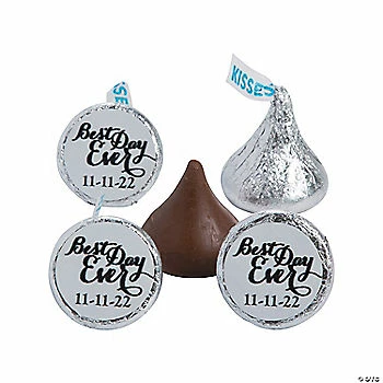 Make your wedding day even sweeter with these Personalized Best Day Ever Hershey’s® Kisses® Stickers! Attach these fun stickers to the bottom of the classic chocolate candy and use them as wedding favors. Scatter the sweet treats on dining tables at your wedding reception for guests to grab or use them in a candy buffet. Personalize with 1 line of up to 8 characters/spaces. Vinyl. (60 pcs. per unit) 3/4″ diam. Candy not included. © OTC