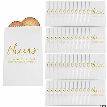 β’ Perfect Size for Parties: These treat bags are just the right size for candies. Fill them up with tasty treats and hand them out as party favors at your next birthday party, holiday gathering or wedding reception!β’ Sweet Style: Display your delicious delights or party favors in style with these fun bags! You can make a decorative statement at any event with these bags, a few treats and some stylish twist ties.β’ Travel-Friendly: Once the party is over, your guests will be happy to take home your favorite cookies, cake pops, cupcakes or other baked goods in these easy-to-carry bags. Product Description:Simplify party favors at your wedding reception, anniversary dinner, fundraiser or any other formal gathering with these lovely and personalized treat bags. Featuring βCheersβ in a lovely script accompanied by personalized text, these treat bags can be filled with cookies or other small treats and given to guests as favors. Leave a stack of these bags at the treat table and allow guests to serve themselves or hand them out pre-filled. Personalize with 2 lines of text. © OTCSize: 5 3/4″ x 8″Quantity: 50Material: Paper.