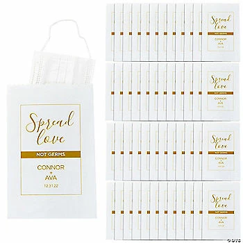 โข Perfect Size for Parties: These treat bags are just the right size for candies. Fill them up with tasty treats and hand them out as party favors at your next birthday party, holiday gathering or wedding reception!โข Sweet Style: You can make a decorative statement at any event with these bags, a stylish way to keep your guests safe.โข Says Thanks with Sweets: Are you looking for an easy way to thank the people in your life? These multipurpose bags filled with great snacks are a sweet way to spread appreciation among party guests, students and teachers, or employees!Product Description:Spread love, not germs at your next social gathering event! Place a clean face cover or mask in each bag and hand them out to guests or safely store a used mask in it. These bags are perfect for weddings, bridal showers, rehearsal dinners and anniversary parties. Personalize them with a special message in your choice of font and color. ยฉ OTCSize: 5 1/2″ x 8″Quantity: 50Material: Paper.